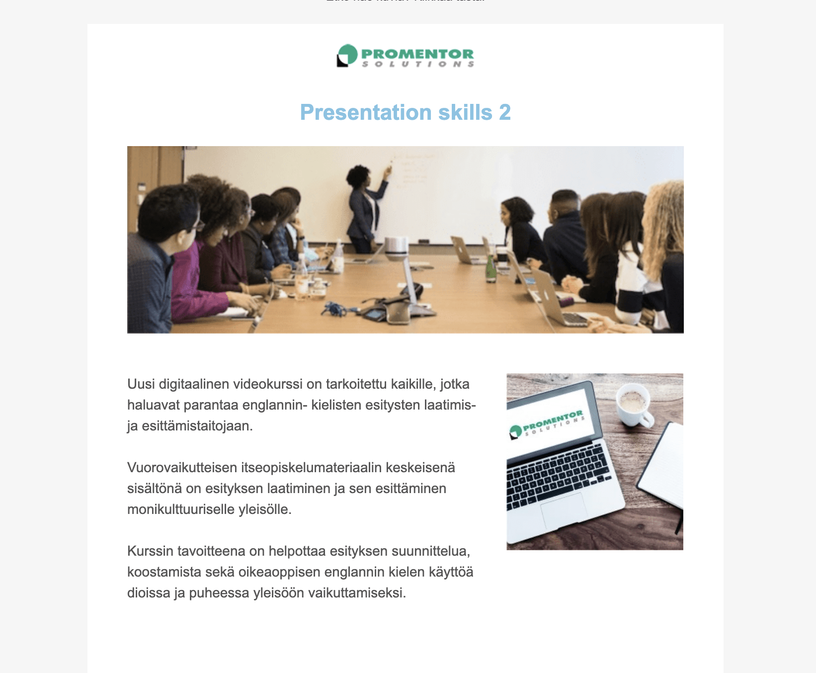 uutiskirje-promentor Päivämäärä 19.11.2025 Jaa: Tiina Nurmi Saatat myös pitää Tervetuloa Promentorin osastolle Digioppimisen kehityspäivänä 23 lokakuun, 2024 Uutiskirje 05/2024 – Haluatko buustata henkilöstön englanninkielisiä esityksiä? 26 toukokuun, 2024 Tunnelmia EDUCA-messuilta 5 helmikuun, 2019